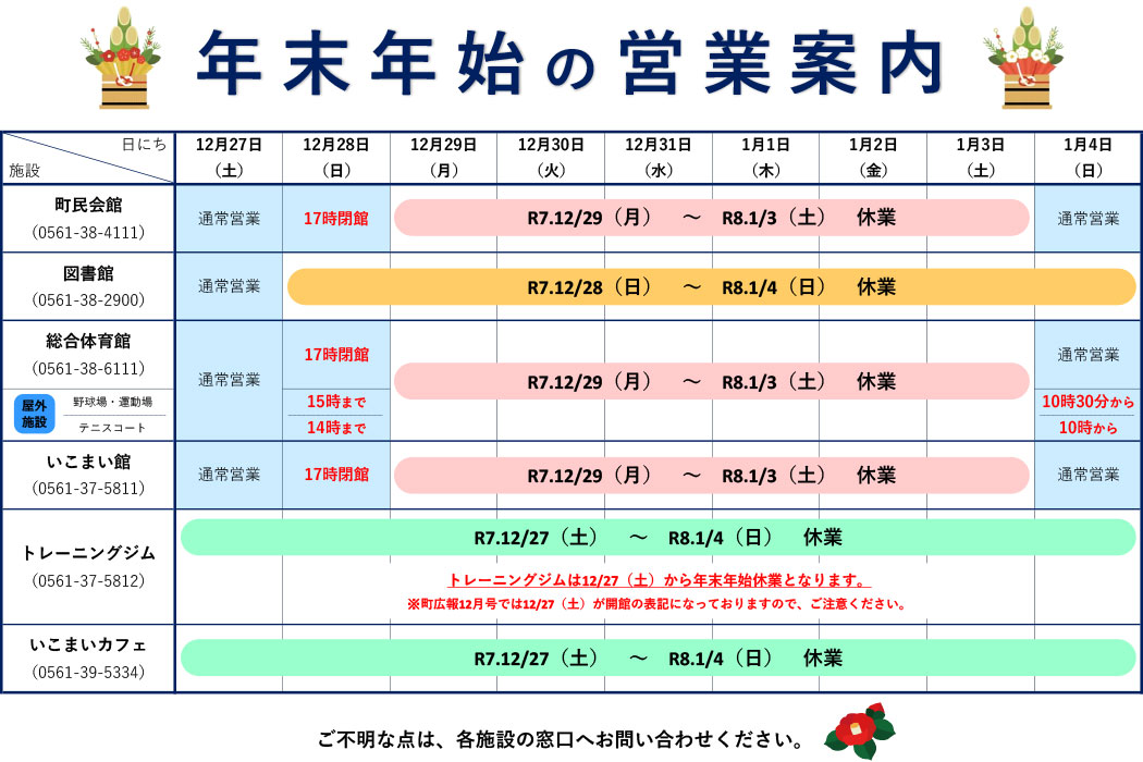 年末年始の営業については、下記『営業案内』(クリックで拡大表示)をご確認いただき、ご不明な点がありましたら各施設へお問合せください。
