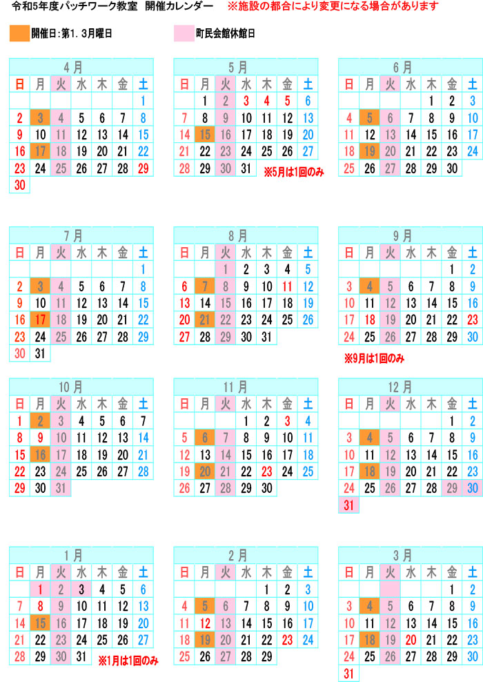 ※施設の都合により変更になる場合があります。詳しい日程は開催カレンダーをご参照ください。