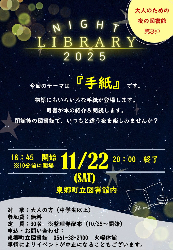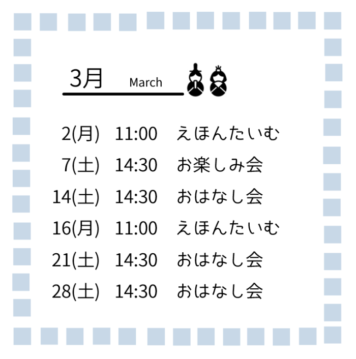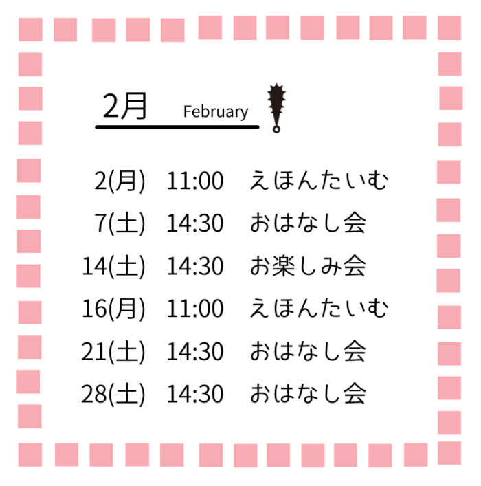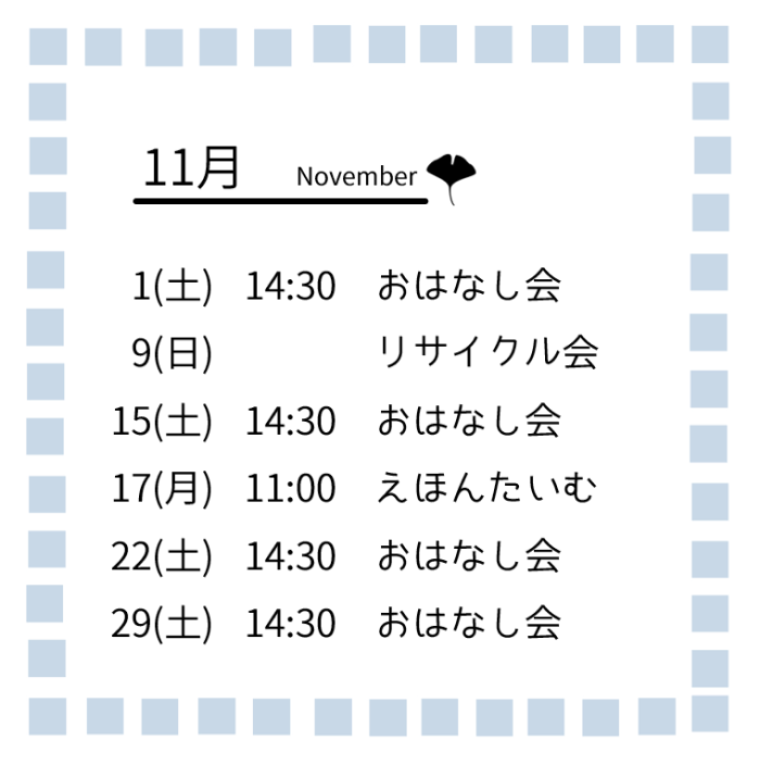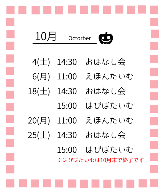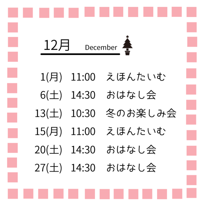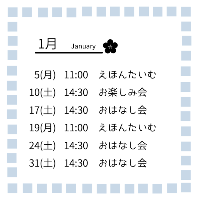 (※蔵書点検、役場行事等で図書館イベントがお休みになることがありますのでご了承ください。)