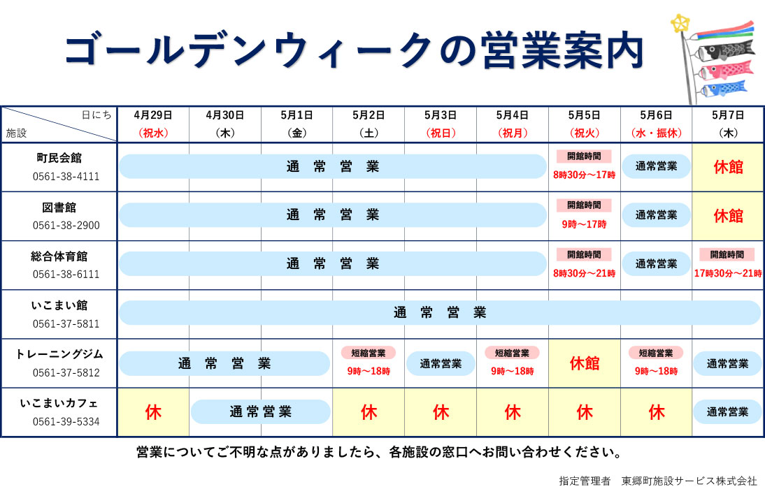 ゴールデンウィークの営業については、下記『営業案内』(クリックで拡大表示)をご確認いただき、ご不明な点がありましたら各施設へお問合せください。