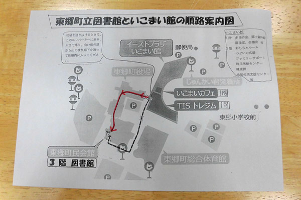 『図書館には、いこまい館から役場を通り抜けて行く事ができます。雨の日も外を通る事なく行く事が出来ますよ』と司書さん。