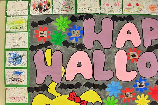 つどいの広場では10月の月間イベントとしてつどいの時間の後に行なえるジャックランタンのぬりえと写真撮影用のパネルを用意しています。