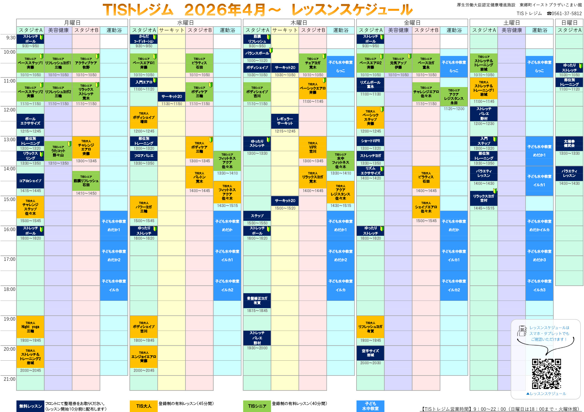 レッスンの開催状況等については、トレジム窓口へお尋ねください。TEL(0561)37-5812